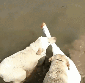 還有前段時(shí)間一只大白鵝要下水玩,兩只熊狗子就死活拖著人家往岸上走,生怕把這大兄弟給掩嘍~
